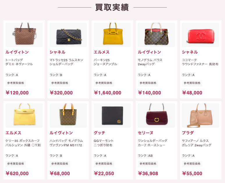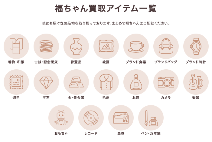 ブランド品だけでなく、着物や硬貨、切手、毛皮、お酒、おもちゃ、金券、万年筆などをまとめて買取してくれるところも人気の秘密。手数料などは一切不要で便利な出張買取も大人気!